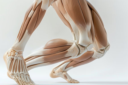 A close up of a leg with the muscles and bones clearly visible. The leg is shown in a 3D model, which gives a sense of depth and realism. Concept of strength and power, as the muscles