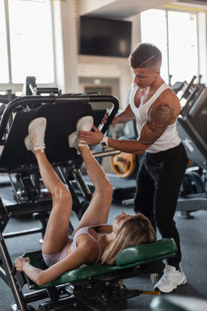 Beautiful athletic fitness couple training together in the gym and work out their leg muscles. Sports girl working out at the gym
