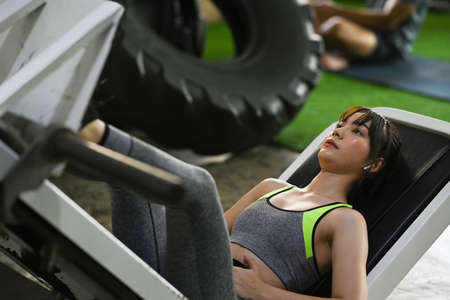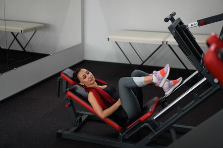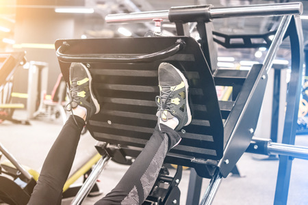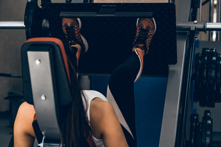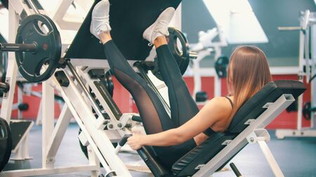 Active girl in the gym in leggings pushing leg press machine and exercising vigorously