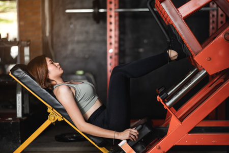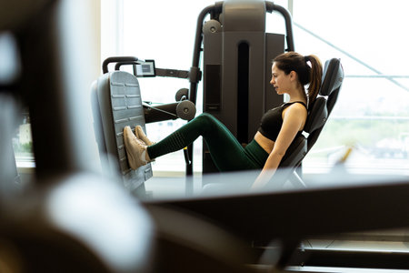 Sportswoman performing lower-body strength exercise on fitness equipment