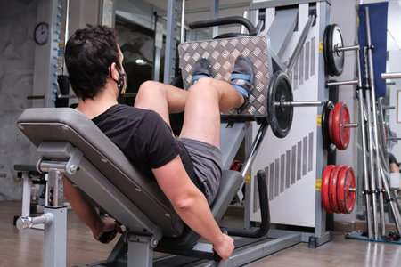 Man wearing face mask doing leg presses in gym. New normal exercise.