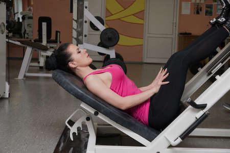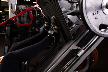 Athletic strong woman lifting weight in gym. Leg press.