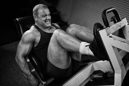 Muscular athlete trains legs on exercise machine