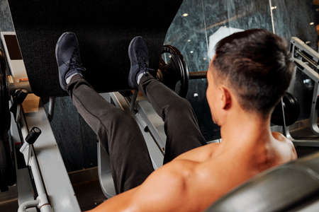 Athletic man doing exercise press leg machine in gym. Power training