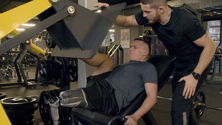 Young man with prosthetic leg using leg press machine in gym
