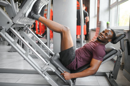Back view of African American man doing exercise on leg press during fitness training in modern gym.