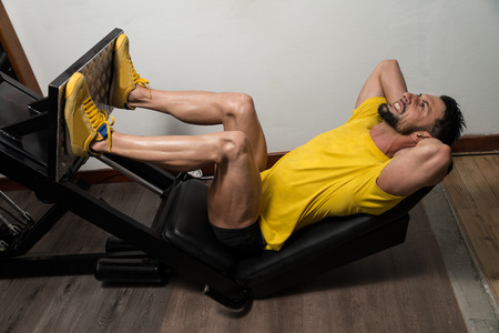 Attractive Young Man Doing Leg Press On Machine In Gym