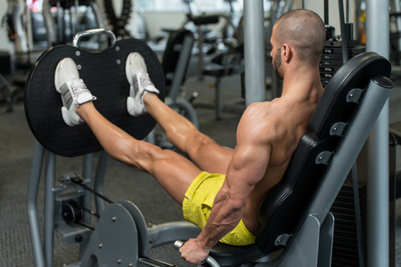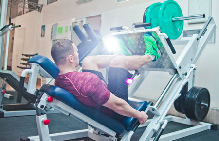 Man in gym training at leg press to define his upper leg muscles