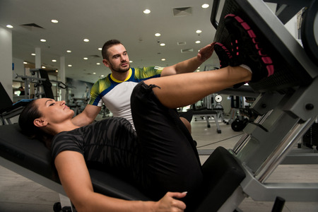 Young Woman Exercise Legs On Machine In The Gym While Personal Trainer Helps Out