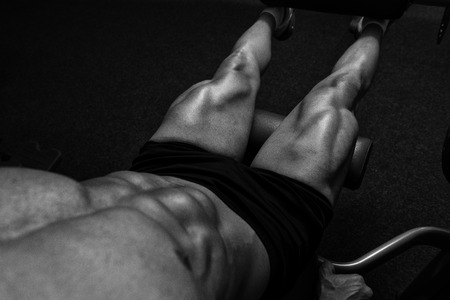 active and muscular man keeping his legs strong and fit by using gym equipment machinnes - filtered image
