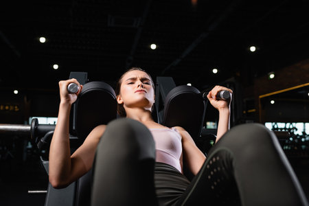 athletic woman with closed eyes exercising on leg press machine on blurred foreground