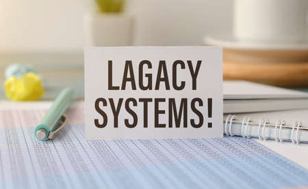 Text LEGACY SYSTEMS on the notepad with office tools, pen