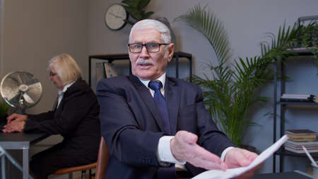 Irritated elderly man boss raising hands in questioning gesture why what in office room. Elderly entrepreneur freelancer dissatisfied with bad results of work reviewing report, documents with errors