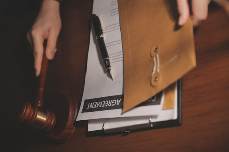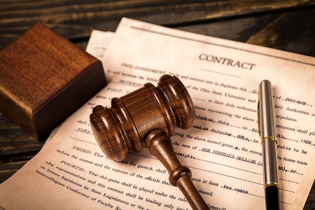legal law judge gavel & contract document at courtroom. lawyer attorney justice workplace