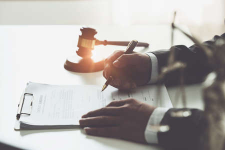 Male lawyer working with contract papers and wooden gavel on tabel in courtroom. justice and law ,attorney, court judge, concept.