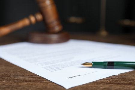 A sleek pen rests on top of legal documents on a wooden desk, alongside a gavel and keys, suggesting a formal agreement or legal signing occasion.