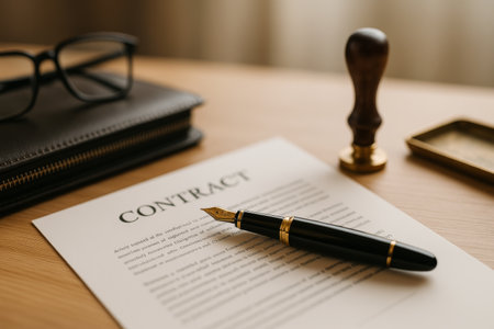 A sleek fountain pen sits poised above a signed document, symbolizing a significant agreement in a professional office environment illuminated by natural light.