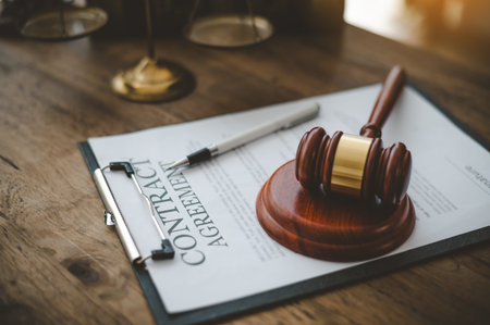 Judge's Hammer and Legal Book on Table - Symbolizing Contract Agreements and Courtroom Proceedings,Law and Justice Concept