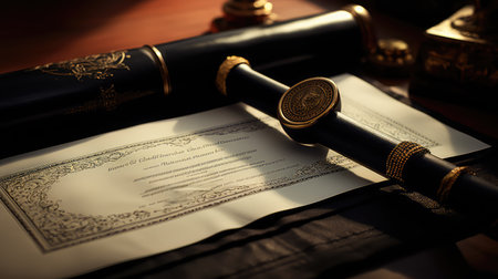 A vintage legal document rests on a rustic wooden desk, accompanied by a pen and scales of justice, showcasing the elegance of law and the importance of the legal profession.