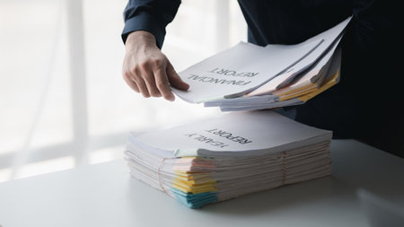 Businessman sorting stacks of department meeting papers, document management in corporate office. Office document management and storage concept.