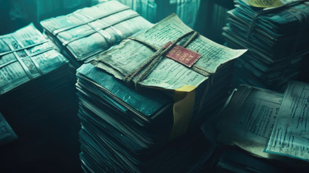 Explore a collection of stacked vintage documents and files in a dimly lit archive. This setting conveys themes of historical research, organization, and the beauty of old paper.