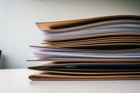 A detailed aerial view of an organized workspace showcasing various documents and files in shades of brown and white, ideal for business and office themes.