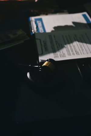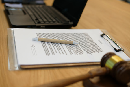 legal law judge gavel & contract document at courtroom. lawyer attorney justice workplace