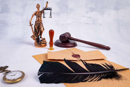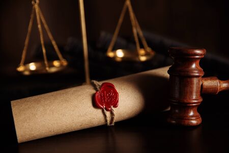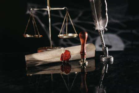 Document with wax seal, scales and antique stamp on a desk. Last will and legacy concept