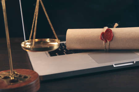 justice and law concept.Lawyer workplace with laptop and documents with dark wooden