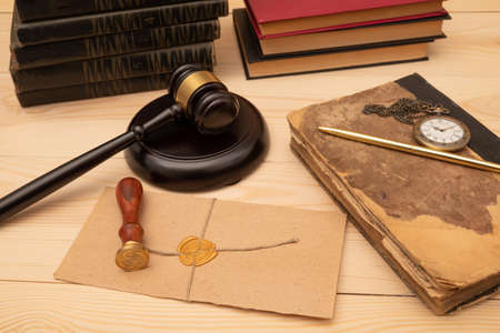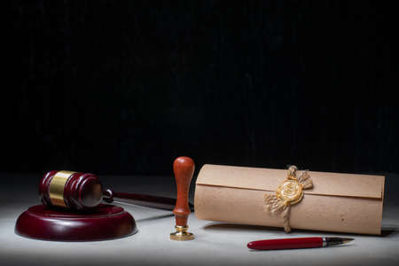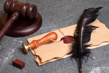 Scroll with wax seal stamp and gavel