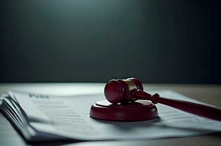 A wooden gavel rests on a pile of legal papers, epitomizing justice and decision-making, surrounded by a calm, expert lighting that creates a professional ambiance.