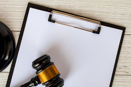 Top view of a blank white paper clipboard with customizable space for text and with gavel next to it