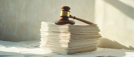 A polished wooden gavel rests on a neatly organized stack of crisp papers, highlighted by soft studio lighting in a serene atmosphere.