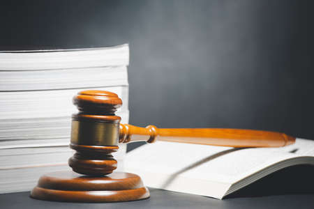 Judge hammer and business report papers, important documents