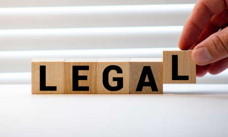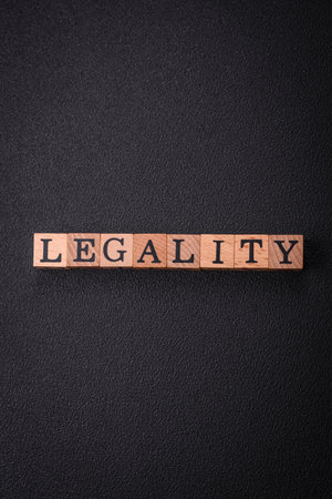 The inscription legality on wooden cubes on a dark concrete background. Can be used as part of your composition