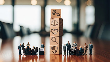 A close-up captures miniature figurines gathered around a stack of wooden blocks. The blocks display business-related symbols. The composition features warm lighting, and shallow depth of field, with a focus on the central subject. This image may be suitable for use in articles, presentations, or various commercial projects related to business.