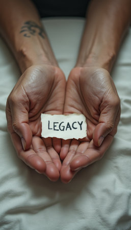 Two hands, gently cupped together, hold a torn piece of paper inscribed with the word LEGACY, symbolizing the importance of heritage and memory. The soft, neutral background enhances the emotional weight of the message, inviting reflection on what we leave behind.