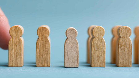 A hand reaches out toward wooden figures lined up against a blue background, symbolizing choice and individuality in a minimalist and creative context.
