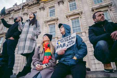 Downing Street, London | UK - 2022.02.26: Ukrainian people protest, thousands gather to demand tougher sanctions on Russia from British Government, EU and USA to stop the war in Ukraine