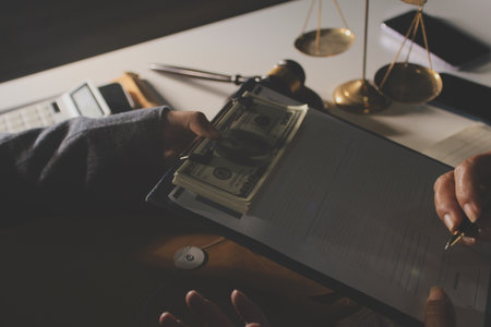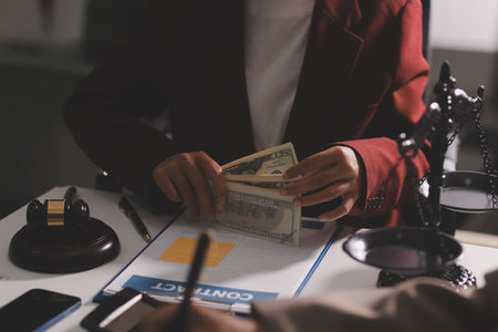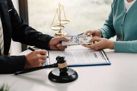 Businesswoman gave the lawyer money to help with the case and sign the contract at the office.