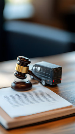 A gavel and a toy truck on a legal document, symbolizing law and transport issues.