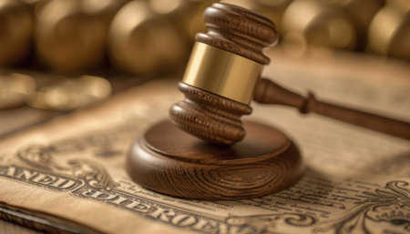A symbolic representation of judicial justice: a judge’s gavel lies on banknotes, reflecting the influence of money on judicial decisions