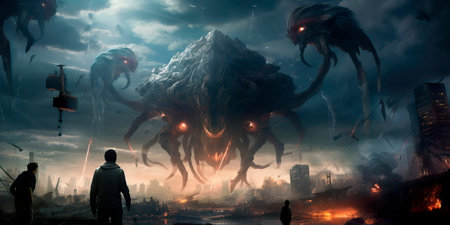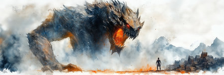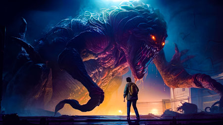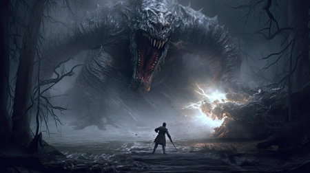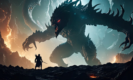 An AI generated illustration of A warrior with a sword standing in front of a giant monster
