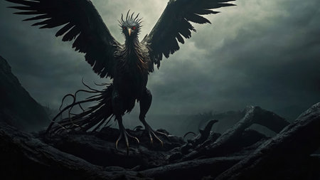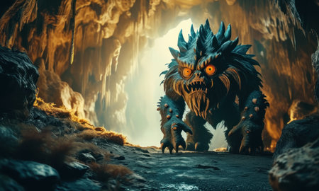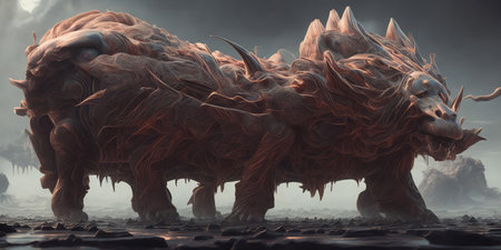 a game of thrones-inspired photo featuring a dwarven beast with spiky eyes. this dark and intense composition, created using vray tracing and darktable processing, showcases a low depth of field and sharp details. the dragon art adds a touch of fantasy to the dark subject matter, while intense close-ups capture the beast's menacing presence. ai generated