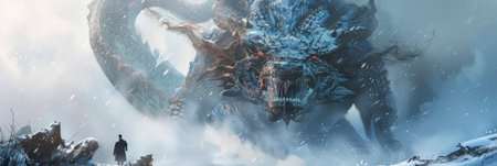 Witness an epic battle of giants. Download this stunning artwork depicting a person facing a colossal ice dragon in a snowy landscape - where fantasy reigns supreme