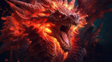A fiery red dragon in mythological portrait, with a dark backdrop. - image generated with Generative AI