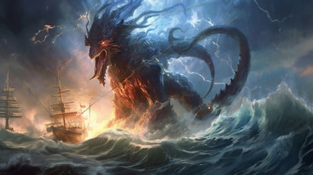 The dark clouds billowing and lightning bolts. The Kraken's massive form rises from the depths, its menacing presence accentuated by the crackling energy of the lightning strikes.