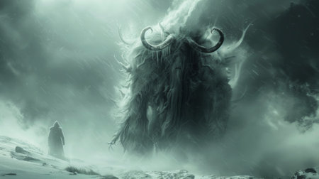monsters lurking in the wilderness - the cover art of the new york times best-selling novel dark is the night. this nature-inspired installation, in the style of frostpunk, captures a lovecraftian atmosphere with its misty, gigantic scale. the stunning beauty of this artwork, shot with a konica hexanon 40mm f1.8 lens, is truly mesmerizing. ai generated