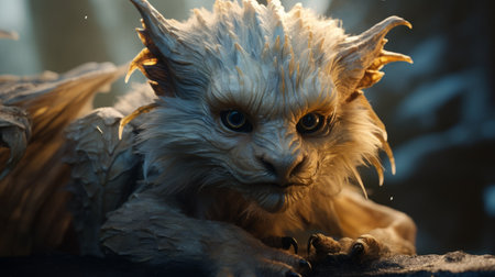 a white dwarf, resembling a fantastical creature, is depicted in this close-up photo. with big eyes and front wings, it exudes a cinematic montage vibe, enhanced by the golden light. rendered in unreal engine, this image captures the essence of goblin academia, reminiscent of the intricate style of franklin booth's illustrations. ai generated