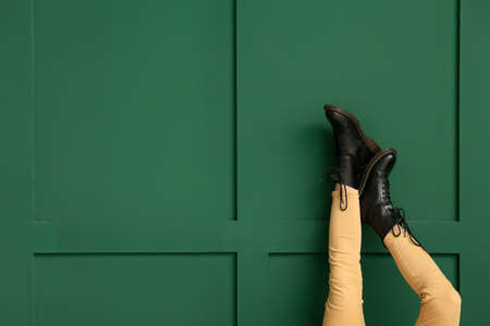 Stylish shoes, outfit. Modern art collage in pop-art style. Legs isolated on trendy colored background with copyspace, contrast. Modern design with copyspace for advertising. Trendy colors.